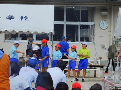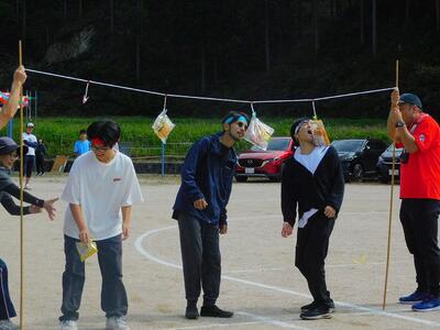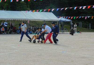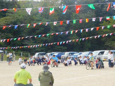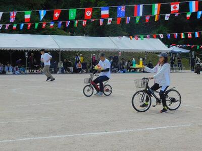 一輪車、三輪車、自転車大、自転車小にまたがって、出前を配達する競技です。昨年度よりも出前物をバージョンアップしたら、落ちるばかりでなかなか進みません。それでも、自然とチームで助け合って競技を進め、即席のチームでしたが絆を深めました。会場は笑い声で溢れていました。