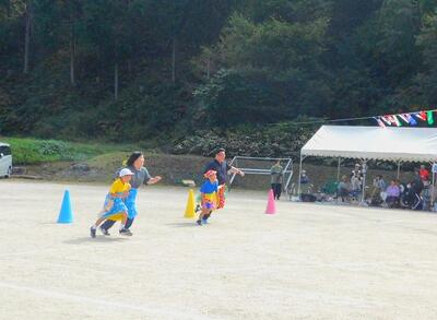 大きなパンツに親子で入り、コーンを回って帰ってくるという単純な競走ですが、歩幅が違うのでなかなか走れないペアが入りかと思えば、親子で競走しあってるペアもあり、スピード感がありました。