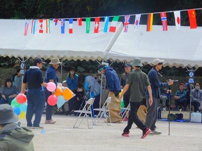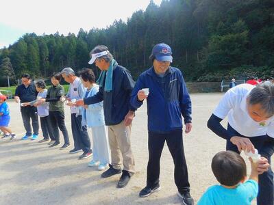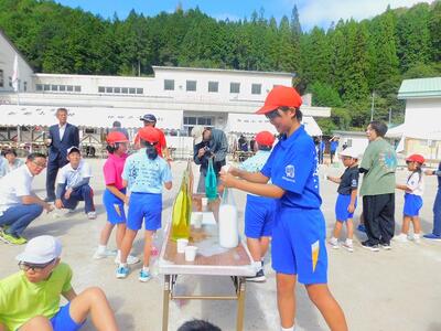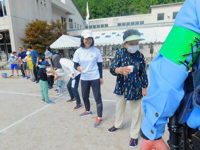バケツリレーの紙コップ版です。色水を紙コップで注ぎながら渡していく競技です。「乾杯」と言いながら、注ぐので、会場は大賑わいです。老若男女、力もいらず、大勢参加できる種目なので、みんあで盛り上がりました。