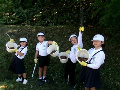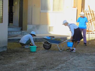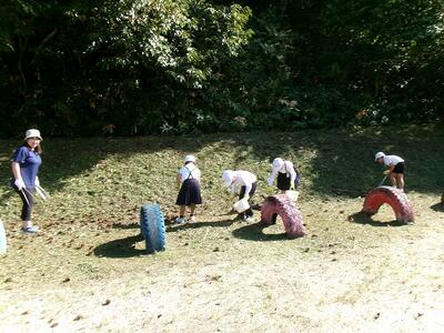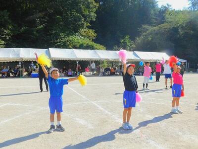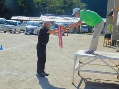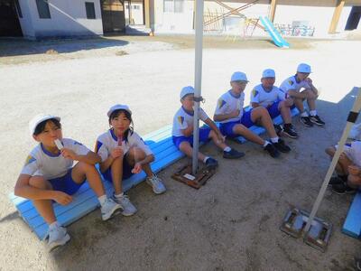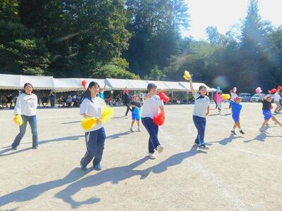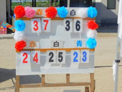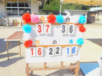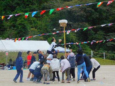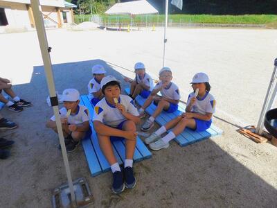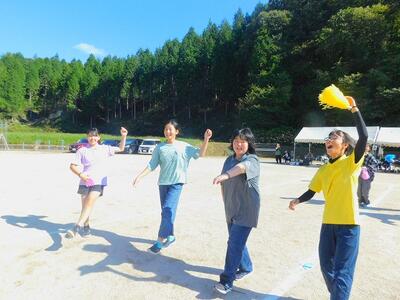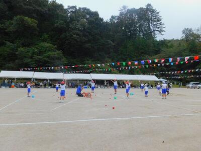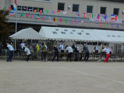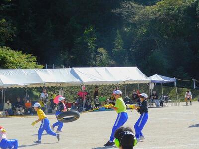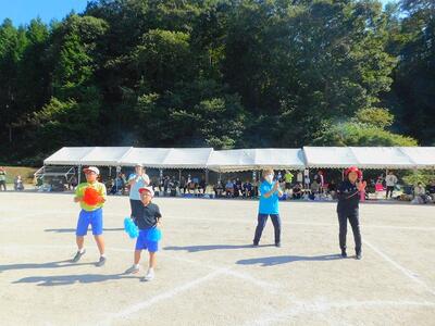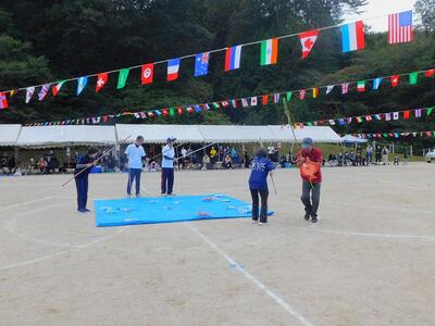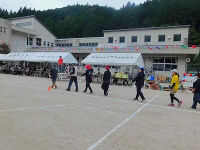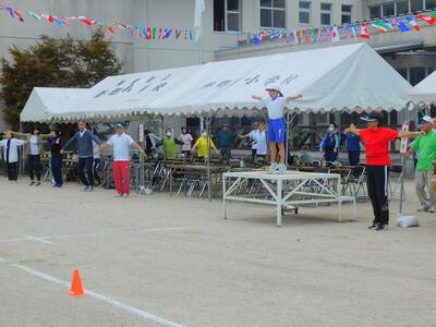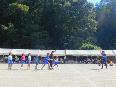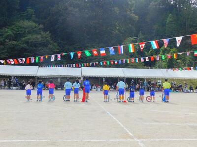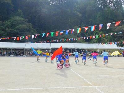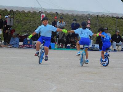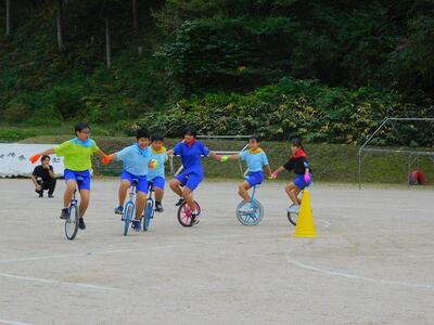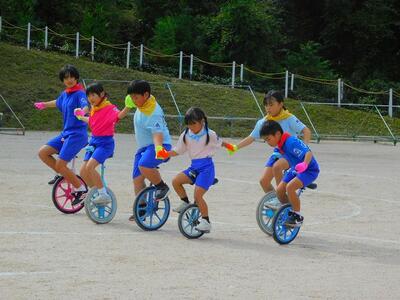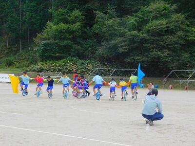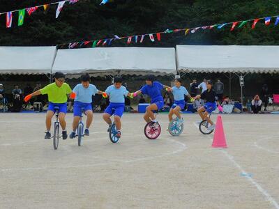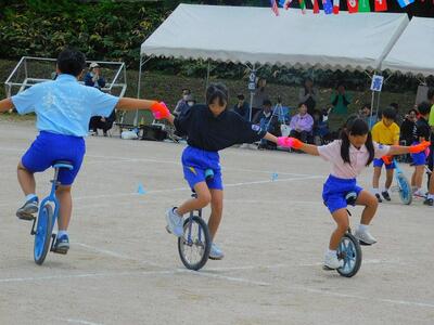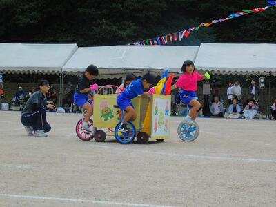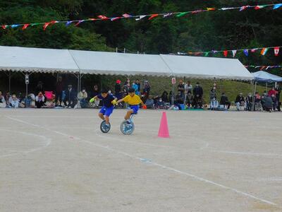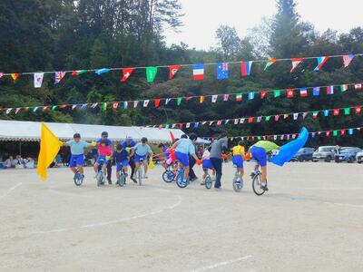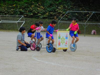 一輪車、三輪車、自転車大、自転車小にまたがって、出前を配達する競技です。昨年度よりも出前物をバージョンアップしたら、落ちるばかりでなかなか進みません。それでも、自然とチームで助け合って競技を進め、即席のチームでしたが絆を深めました。会場は笑い声で溢れていました。