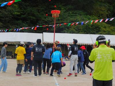 バケツリレーの紙コップ版です。色水を紙コップで注ぎながら渡していく競技です。「乾杯」と言いながら、注ぐので、会場は大賑わいです。老若男女、力もいらず、大勢参加できる種目なので、みんあで盛り上がりました。