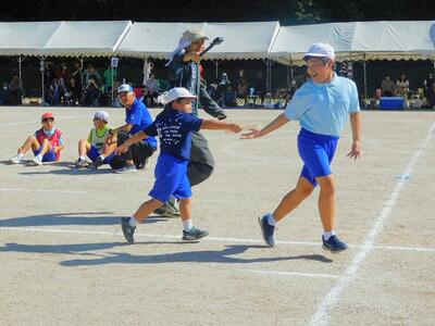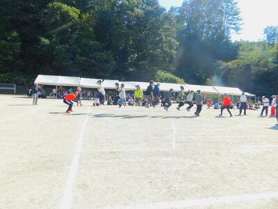 大きなパンツに親子で入り、コーンを回って帰ってくるという単純な競走ですが、歩幅が違うのでなかなか走れないペアが入りかと思えば、親子で競走しあってるペアもあり、スピード感がありました。