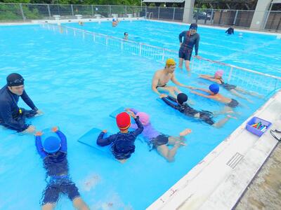 まずは、1〜3年生が補助プールで、水中での息の吐き方やけのびの仕方や姿勢を教わりました。途中、宝探しなどのゲームも交えての練習だったので、楽しく取り組むことができたようです。「息の吐き方」が上手になったと自覚した子がたくさんいました。
