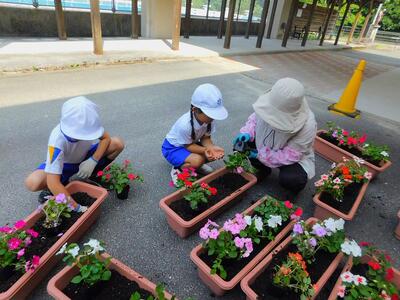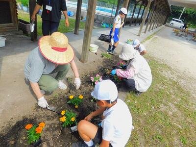 7月2日(水)の朝、ボランティアさんの協力をいただき、1〜3年生で、プランターとプロムナードの花壇に花苗をうえました。花は、マリーゴールドとインパチェンスです。プランター30個と後は花壇。