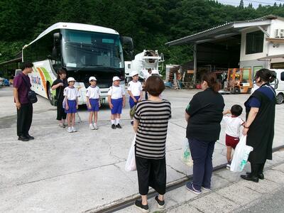 朝は、集合場所まで家族に送ってもらい、千屋小の5年生と一緒にバスに乗り込みました。