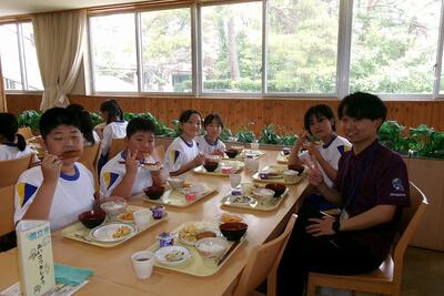 水泳教室の後は、藤井先生も一緒に給食を食べました。神郷地区の自然豊かな話をたくさん聞いてもらい、子ども達も嬉しそうでした。もちろん片付けも一緒にしました。