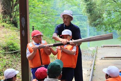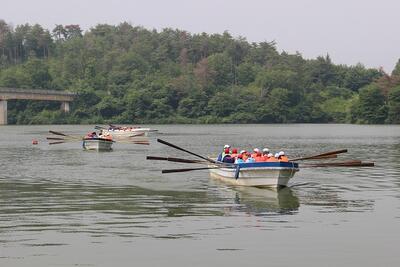 最初の活動は、「カッター漕ぎ」です。まず、櫂の持ち方や基本の声かけなどを教わり、カッターに乗り込みました。