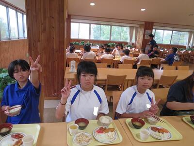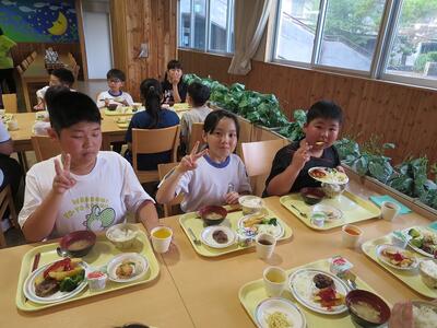 たくさん食べて、頑張るぞ!!神代小の友達と一緒に食べました。