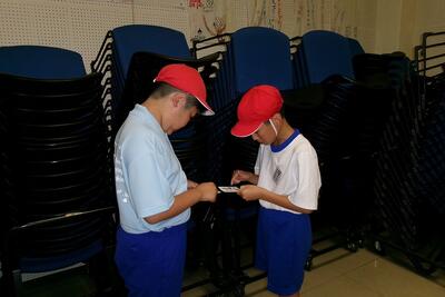 給食の準備は全員でします。今日は、エアコンがよく効いた情報教室で食べました。