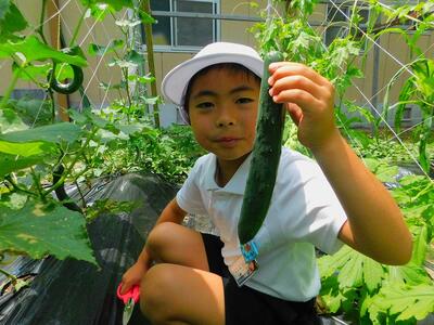 7月3日・4日と5年生が宿泊研修に言っている間、学校は1〜3年生と6年生の7名だけ。学校が とても静かでした。それでも元気に活動しています。畑にいて野菜の収穫。
