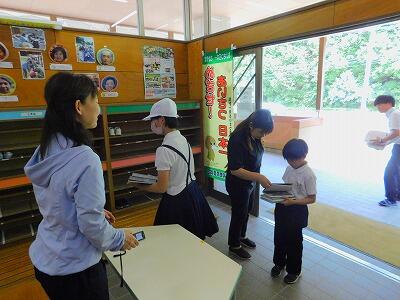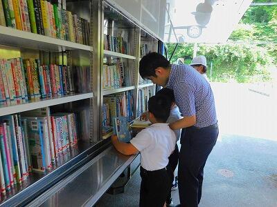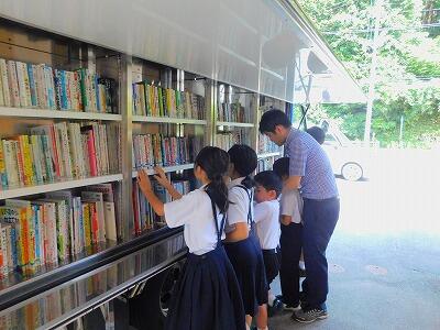 今日の業間には、新見中央図書館から移動図書館車が来校し、子どもたちが思い思いの本を借りていました。赤・青・黃のテープで分けられた本、今回は色を意識して借りていました。
