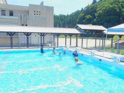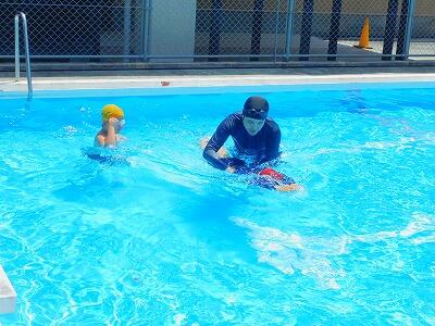 5・6年生の最大の目標は、水泳記録会に出場することです。そのためには、しっかり泳力をつけることが大事です。中務先生が手のかき、足の蹴りなど、丁寧に教えています。