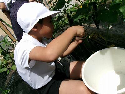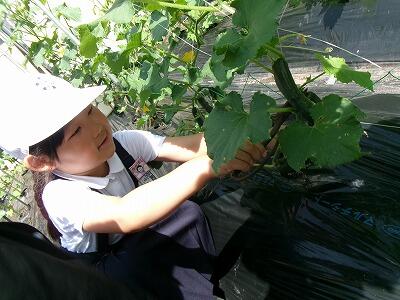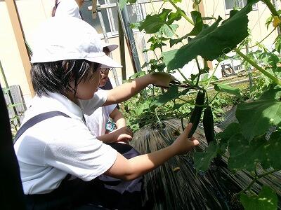 6月26日(木)、順調に育ったキュウリを初めて収穫しました。1・2年生が収穫し、持ち帰りました。