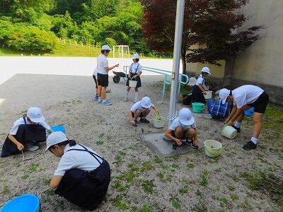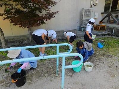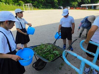 今日は、完全に日陰になっているところを子ども達と一緒に取りました。一輪車(運搬車)一台がいっぱいになるほどに取れたのでびっくりです。きれいになりました。ありがとうございました。