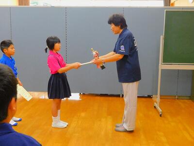 9月22日(月)の児童朝礼では、始めに漢字検定の合格者と神代JVCの準優勝を表彰しました。