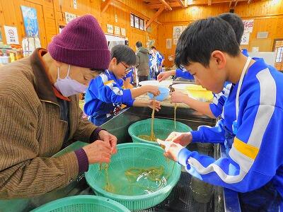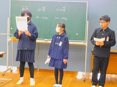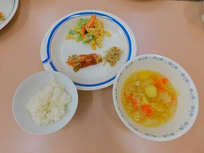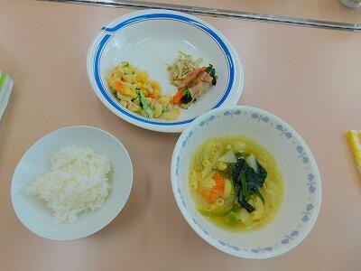 2月14日(金)の1・2時間目に、高学年は調理実習をしました。献立は、「ごはん・野菜のベーコン巻き・野菜サラダ・野菜スープ」です。
