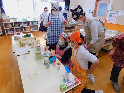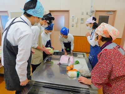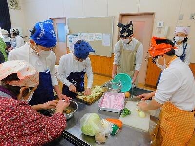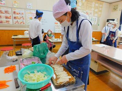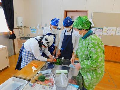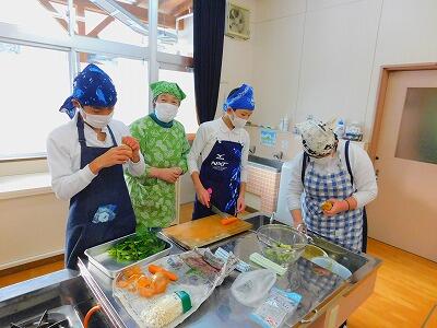 今日は、2人のボランティアの方にお手伝いいただき、実習をしました。お米の計り方、材料の洗い方、切り方、用具の使い方など、たくさんのことを教えていただきながら、調理を進めていきました。野菜が高い時期なので、可能な範囲で材料を持ち寄りました。じゃがいもの芽が出ていたので、処理の仕方を実践することができました。