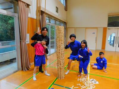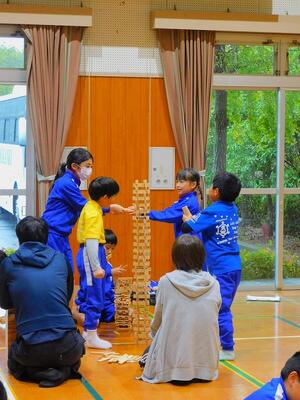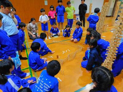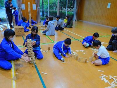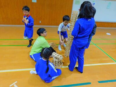 その後、グループに別れて、「カプラ」で遊びました。最初は、めいめいに作っていた子ども達ですが、そのうちタワー作りになり、協力しながら作っていました。あちこちに背よりも高いタワーが立ち、大満足の様子でした。今回もいい交流ができました。
